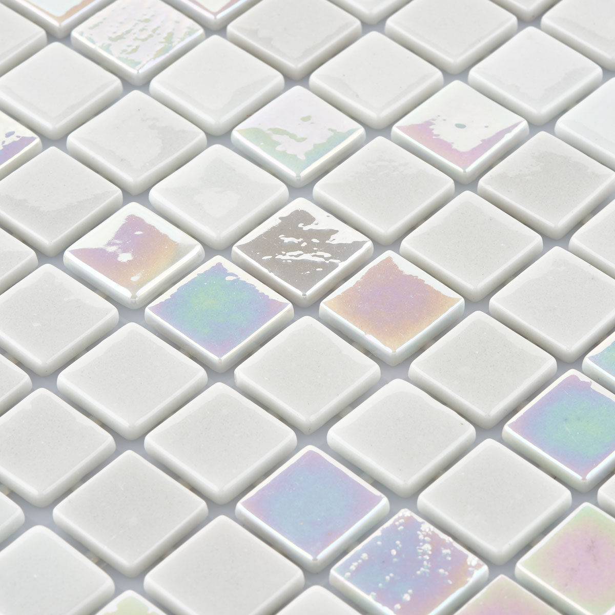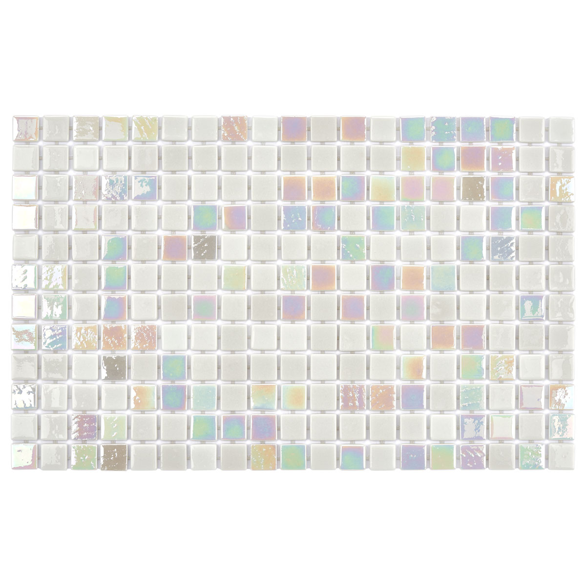 The Glass Pool Tiles BP-941 feature a luminous blend of pearl white with iridescent rainbow accents that shimmer beautifully under water and sunlight. Each 1″×1″ mosaic chip has a glossy glazed finish, with select tiles showcasing a prismatic effect that shifts color depending on the angle of light. Backed with Polybond technology, BP-941 offers exceptional durability and reliable performance in Vancouver, British Columbia, and across Canada.