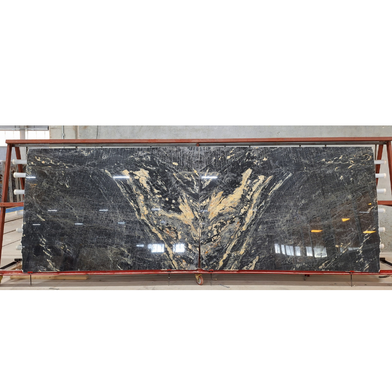 Nero Picasso Marble is a premium Turkish marble celebrated for its intense contrast and painterly veining. The stone combines dark graphite tones with flowing gold and light mineral accents, creating a dynamic, almost abstract composition. Each slab is completely unique, making Nero Picasso a favorite for designers seeking a bold, one-of-a-kind natural surface.